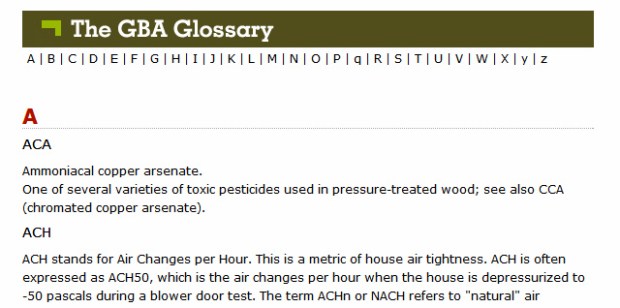 Usually, we post a definition of a term that we have heard a lot recently, or that is being used in several ways. Today, I am posting a resource for looking up terms related to green building, the Green Building Advisor Glossary.
