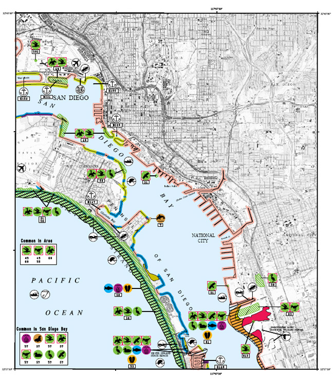 As a result of this major spill, new procedures were instituted, existing procedures were revised, and new information was gathered. The National Oceanographic and Atmospheric Administration (NOAA) Office of Response and Restoration (OR&R) developed Environmental Sensitivity Index (ESI) sensitivity maps, which plot information about the shoreline and biological and human-use resources. This helps responders identify risks and develop priorities quickly. An example  of an ESI map of San Diego Bay (from NOAA’s website) is below.