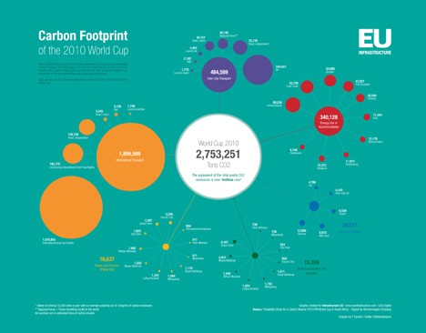 The answer to the carbon footprint question is: BIG. According to a pre-event study estimate by the South African Department of Environmental Affairs and Tourism in conjunction with the area Norwegian embassy, the carbon footprint for the event is 2.8 million tons. To quote Mike Berners-Lee, posting on the UK Guardian’s Green Living blog, “(that) is roughly equivalent to 6,000 space shuttle fights, three quiet years for Mount Etna, or 20 cheeseburgers for every man, woman and child in the UK.”